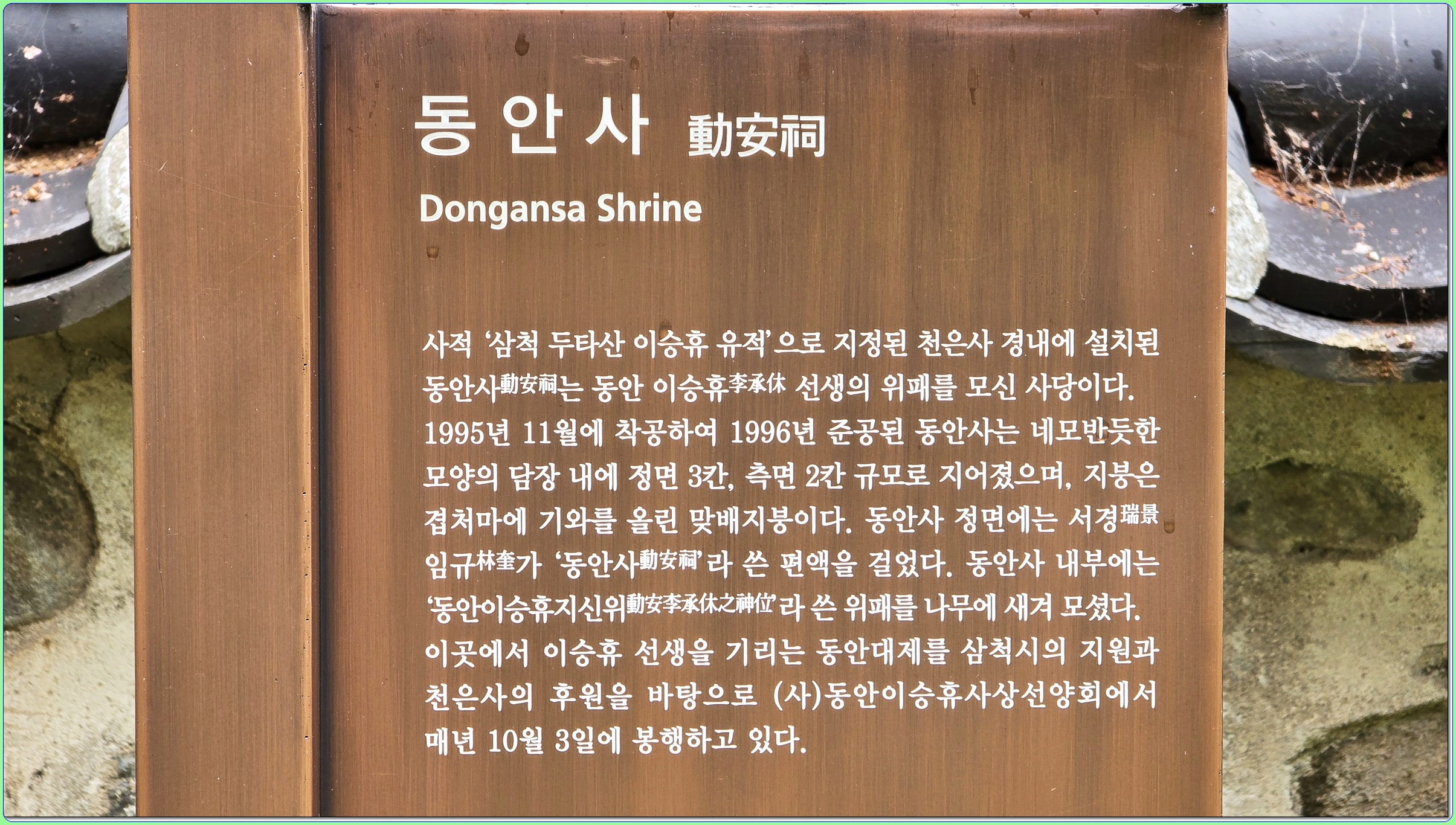 두타산 천은사(頭陀山 天恩寺), 천은사 유래비강원특별자치도 삼척시 미로면 동안로 816 (내미로리 785)천은사 유래비동안 이승휴 상징 조형물 동안 이승휴 상징 조형물우리 민족의 대표적인 역