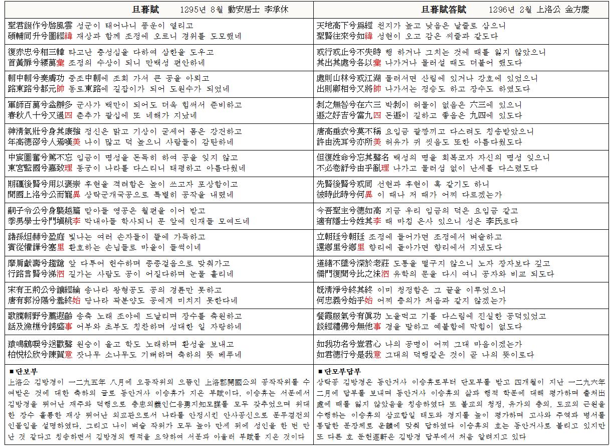 | 旦暮賦 둔헌(遯軒 李承休) 聖君誕作兮啓風雲 성군이 태어나니 풍운이 열리고 碩輔同升兮圖經緯 재상과 함께 조정에 오르니 경위를 도모했네 復赤忠兮相三韓 타고난 충성심을 다하여 삼한을 도우고 首黃扉兮䌁萬彙 조정의 수상이 되니 만백성 편안하네 朝中朝兮奏膚功 중조中朝에 조회 가서 큰 공을 아뢰고 路東路兮都元帥 동로東路에 길잡이가 되어 도원수가 되었네 軍師百萬兮益辦多 군사가 백만이 되어도 더욱 힘써서 준비하고 春秋八十兮又過四 춘추가 팔십에 또 네해가 지났네 神淸氣壯兮身其康強 정신은 맑고 기상이 굳세어 몸은 강건하고 年高德邵兮人焉嘆美 나이 많고 덕 높으니 사람들이 감탄하네 中宸圖奮兮篤不忘 임금이 명성을 돈독히 하여 공을 잊지 않고 東宮監國兮嘉致理 동궁이 나라를 다스리니 태평하고 아름다웠네 期礪後賢兮用以褒崇 후현을 격려함은 높이 쓰고자 포상함이고 開國上洛兮公而寵異 상락군개국공으로 특별히 공작을 내렸네 嗣子令公兮身襲越篇 맏아들 영공은 월편을 이어 받고 季男學士兮門塡桃李 막내아들 학사되니 문 앞에 인재들 모여드네 諸孫炟赫兮盈庭 빛나는 여러 손자들이 뜰에 가득하고 賓從懽譁兮塞里 환호하는 손님들로 마을이 들썩이네 摩肩獻壽兮趨蹌 앞 다투어 헌수하며 종종걸음으로 맞춰가고 行路言賢兮涕泗 길가는 사람도 공이 어질다하며 눈물 흘리네 宋有王荊公兮讓經綸 송나라 왕형공도 공의 경륜만 못하고 唐有郭汾陽兮羞終始 당나라 곽분양도 공에게 미치지 못한다네 歌騰朝野兮薦遐齡 송축 노래 조야에 드날리며 장수를 축원하고 話及漁樵兮誇盛事 어부와 초부도 칭찬하며 성대한 일 자랑하네 猿鳴鶴唳兮送歡聲 원숭이 울고 학도 노래하며 환성을 보내고 柏悅松欣兮陳賀意 잣나무 소나무도 기뻐하며 축하의 뜻 베푸네 1295년 8월 동안거사 이승휴(動安居士 李承休) |