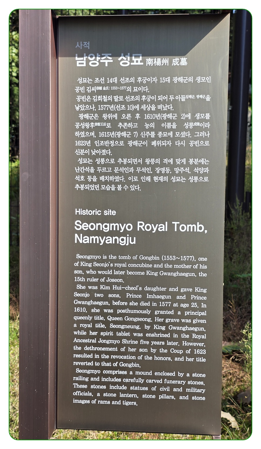 15대 광해군의 생모 공빈김씨(恭嬪金氏,1553~1577)의 묘이다.
